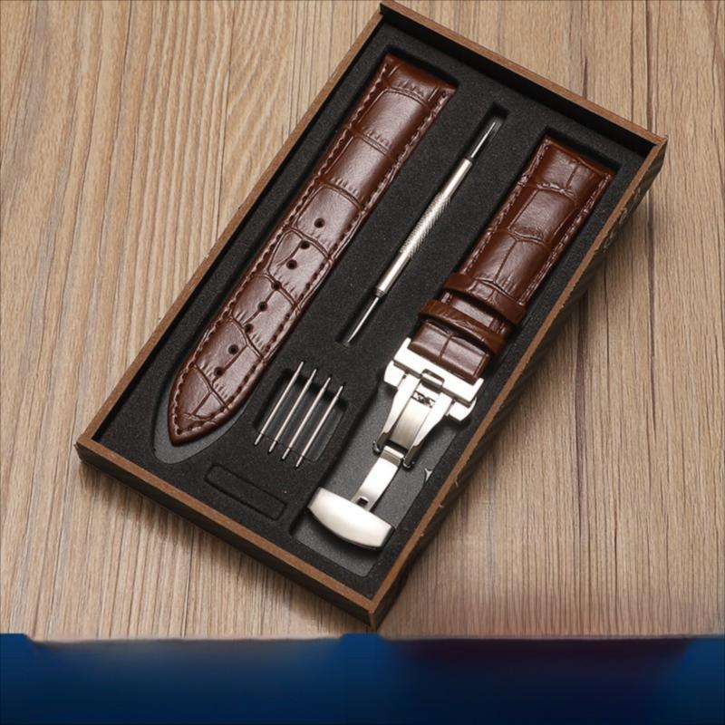 Upgrade your watch with this premium genuine cowhide leather strap, designed for comfort, durability, and style. Featuring a polished stainless steel double push-button butterfly clasp, this strap ensures a secure fit while adding an elegant finish to your timepiece.